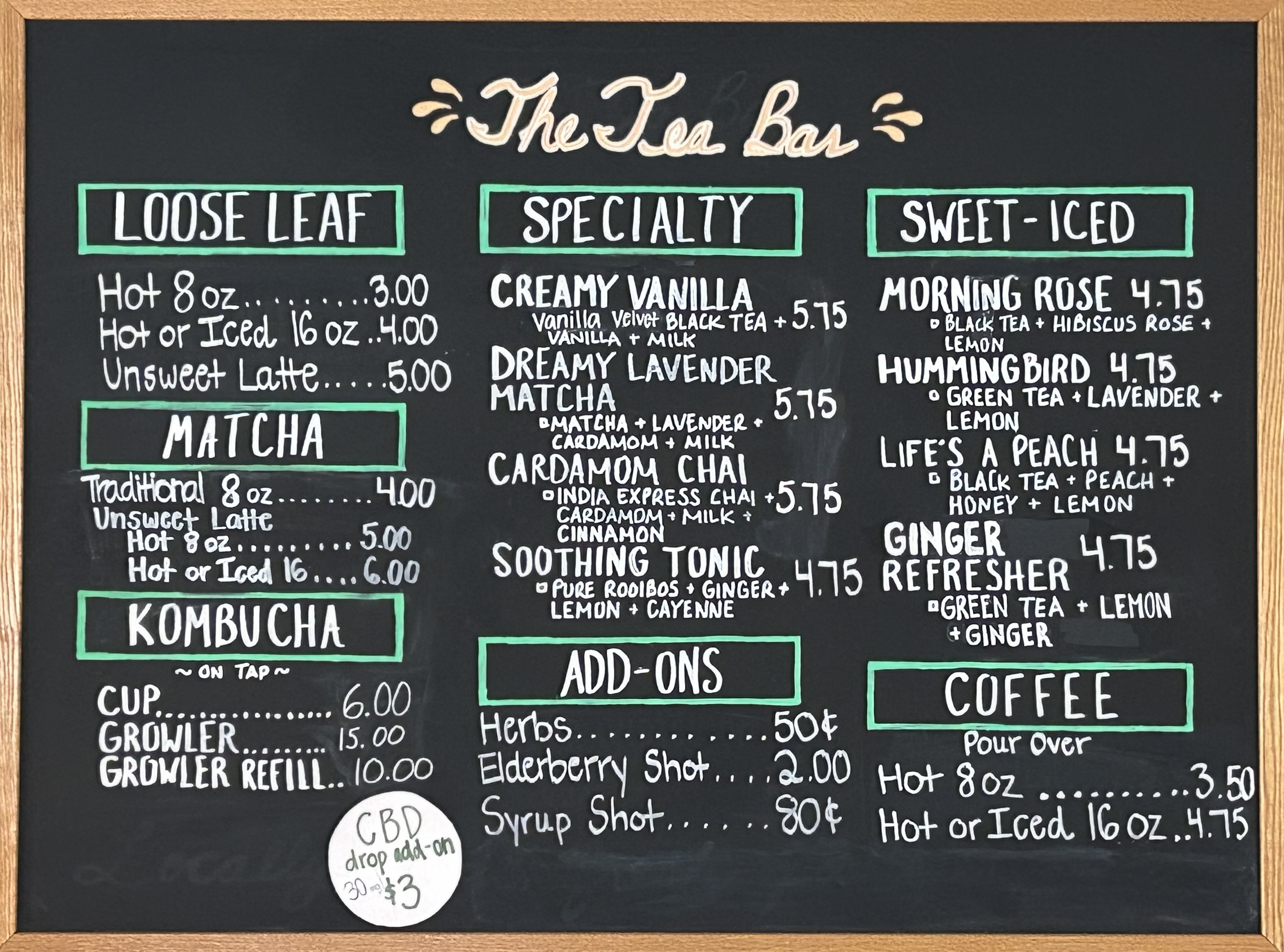Our Tea Bar menu also includes ceremonial grade matcha, coffee pour overs, kombucha on tap, sweet iced teas, tea lattes and wellness teas. We use local, raw honey and small batch and organic syrups to sweeten and flavor our specialty drinks.